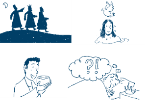 Een nieuw begin. Johannes doopt mensen in de Jordaan; zo maken ze een nieuw begin. Ook Jezus laat zich dopen. De heilige Geest daalt als een duif op Hem neer en er klinkt een stem uit de hemel.